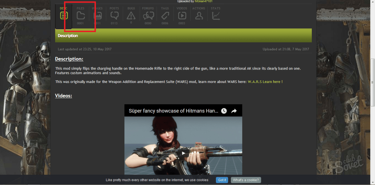 - Как только вы попадете на страницу мода, сверху появится небольшое меню со вкладками. Выберете “Files”.