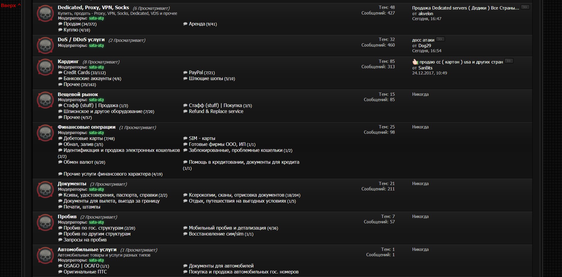 Про даркнет ходит много страшилок, и 90% из них — правда. Эта часть интернета давно превратилась в черный рынок, особенно когда появился Bitcoin, который считается основной валютой темной сети. В даркнете продают много запрещенных товаров и услуг (логины, пароли, паспортные данные, номера и пин-коды банковских карт), поддельные документы, краденую электронику и т.д.