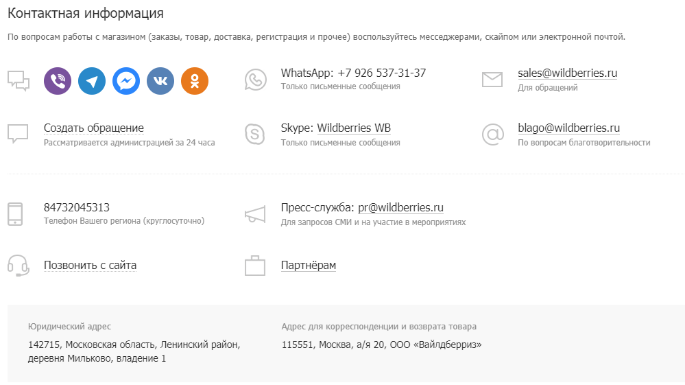 Контакты Wildberries