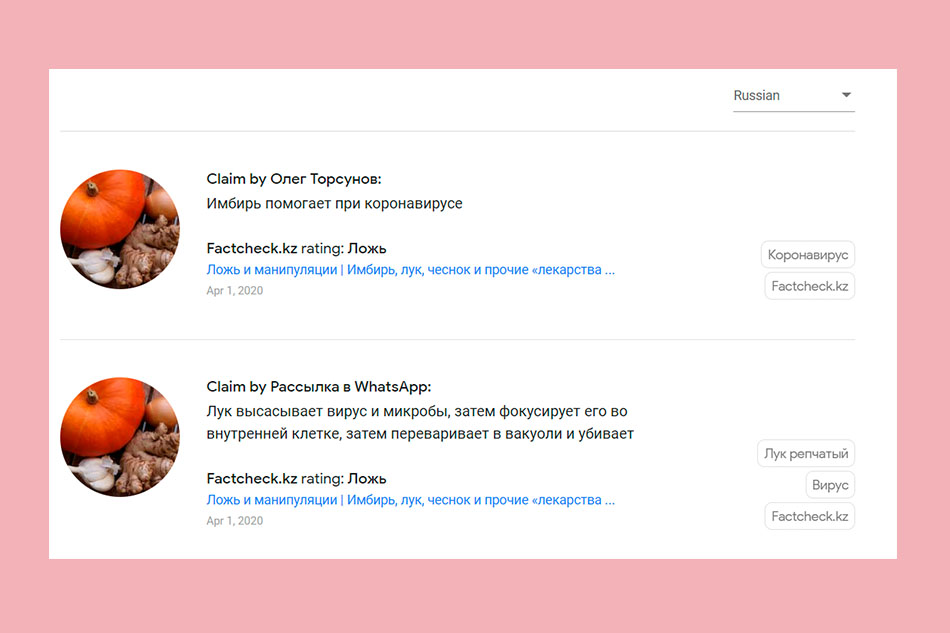 Fact Check Explorer от Google – этот инструмент помогает проверить правдивость сообщения. В поисковой строке введите тему или заголовок новости – появится анализ материала. Классический пример: в начале пандемии была информация, что чеснок и имбирь помогают не заболеть коронавирусом. Вводим «имбирь коронавирус». Вот что выдает ресурс: