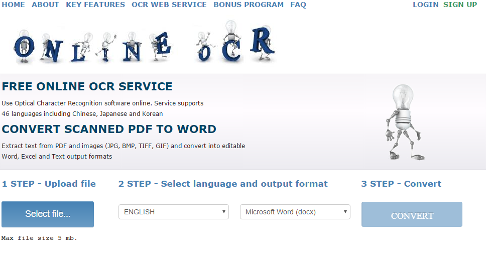 Использовать инструмент очень легко, просто выберите файл изображения, выберите язык документа и загрузите изображение. После загрузки изображения, нажмите кнопку «OCR», и программа начинает конвертировать загруженное изображение.
