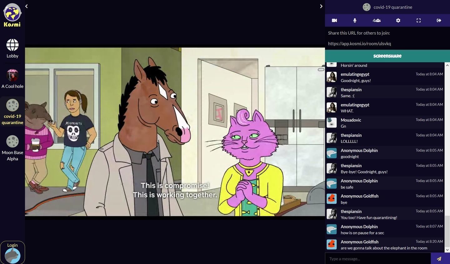 Есть сервисы, которые работают без регистрации: это Kosmi, Watch2gether и Metastream. В них можно попросту создать комнату, задать настройки приватности и начать что-нибудь транслировать. Так, в Kosmi есть функция захвата изображения с экрана, так что с этим сайтом никто не мешает открыть видеофайл или приложение стримингового сервиса и показывать картинку тем, кто соберется в комнате. За счет этого можно транслировать практически все, что угодно.