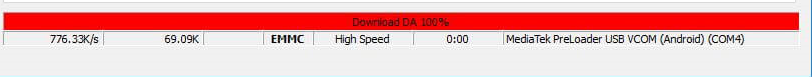 Отключаем смартфон. Ждем 15 секунд. Включаем аппарат и подключаем его к ПК. Все строки в программе должны стать неактивными. Появится внизу полоса «Download DA 100%».