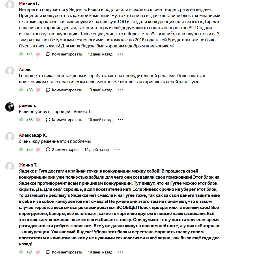 Единственный положительный момент для людей, которым не нравится это новшество, заключается в том, что разработчики заявили о своем отслеживании всех отзывов в сети, связанных с данным функционалом. То есть, если их будет очень много, они будут отрицательными и аргументированными, то, возможно, от использования такого блока откажется сама компания Яндекс. Но как показывает практика, это мало вероятно.