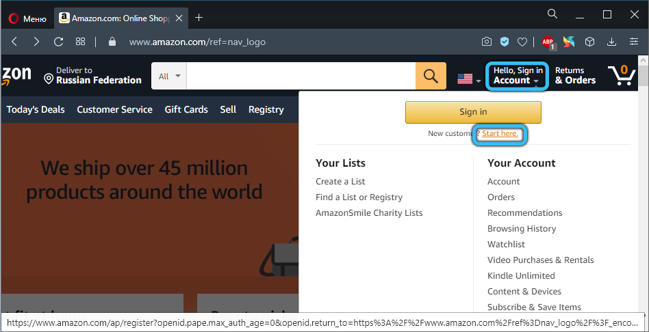 - Навести курсор на раздел «Account and Lists» и нажать на фразу «New customer? Start here», расположенную под кнопкой «Sing in».