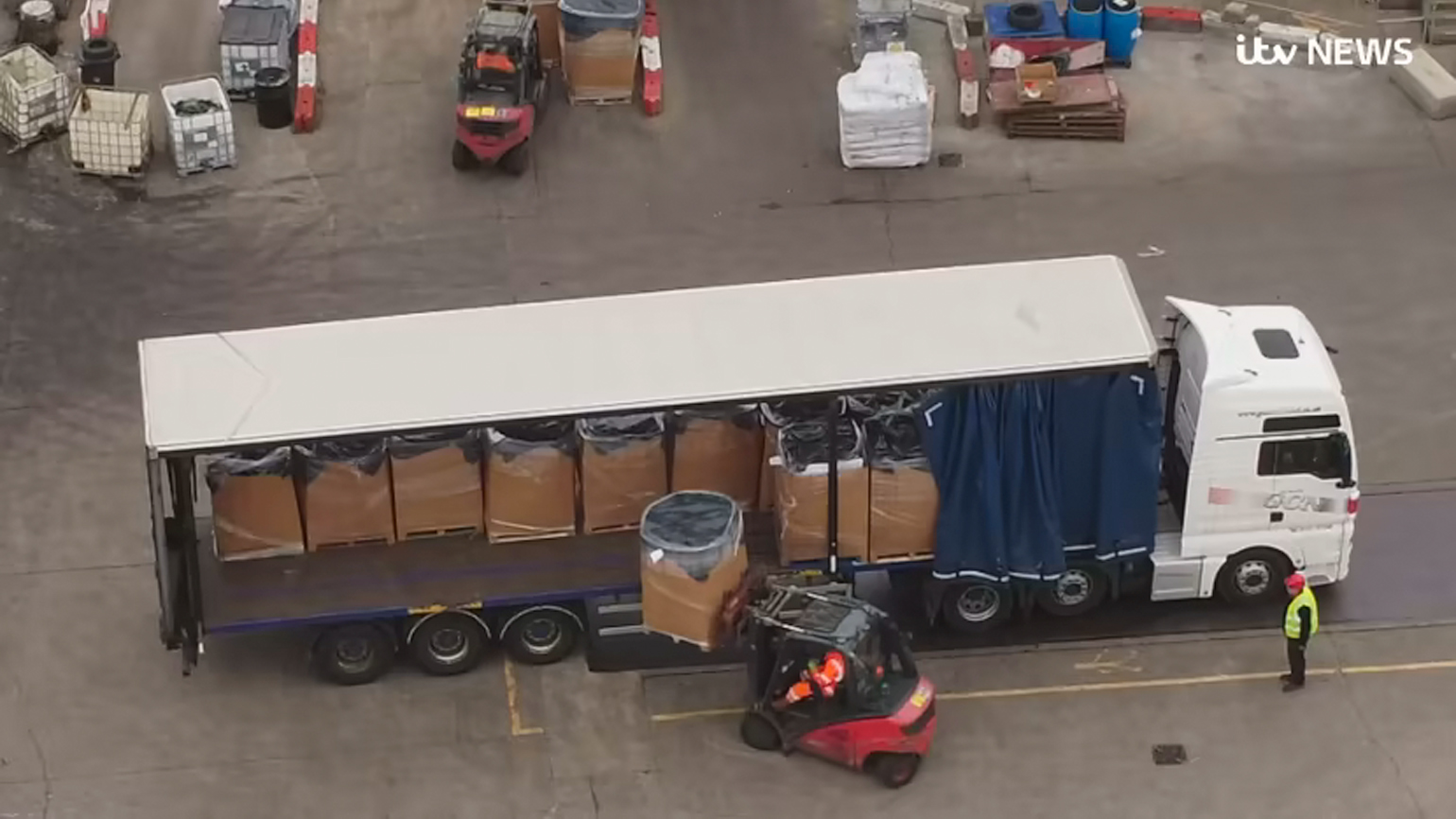 Камеры ITV News сняли контейнеры с ненужными товарами, которые выгружают на площадке по переработке отходов недалеко от склада Amazon в ДанфермлинеКадр: ITV News