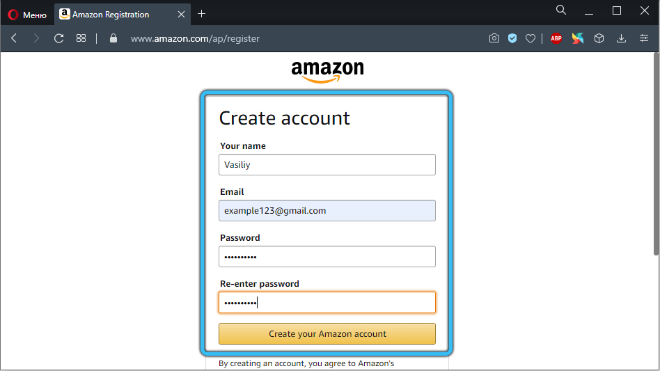 • Появится окно, где нужно кликнуть по «Create your Amazon account».