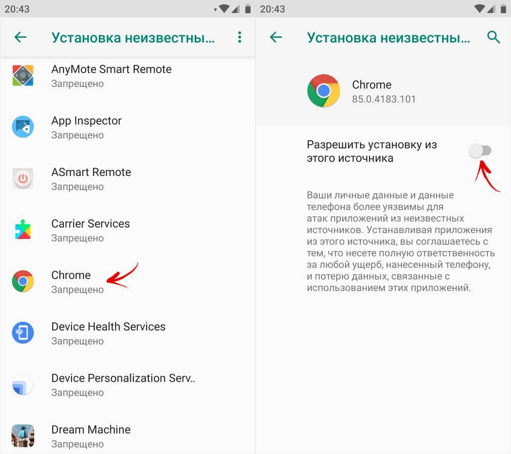 Затем выберите источники, которым необходимо предоставить разрешение на установку .apk-файлов, к примеру: браузер Chrome и файловый менеджер Total Commander. По очереди откройте их настройки и активируйте переключатель «Разрешить установку приложений».
