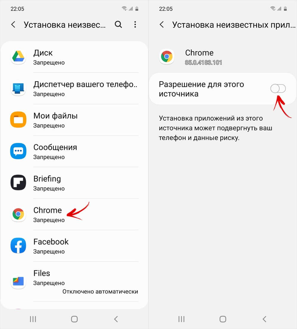 Выберите среди них те, которым хотите предоставить разрешение на установку приложений, например: браузер и файловый менеджер. По очереди откройте их настройки и активируйте тумблер «Разрешить установку из этого источника».