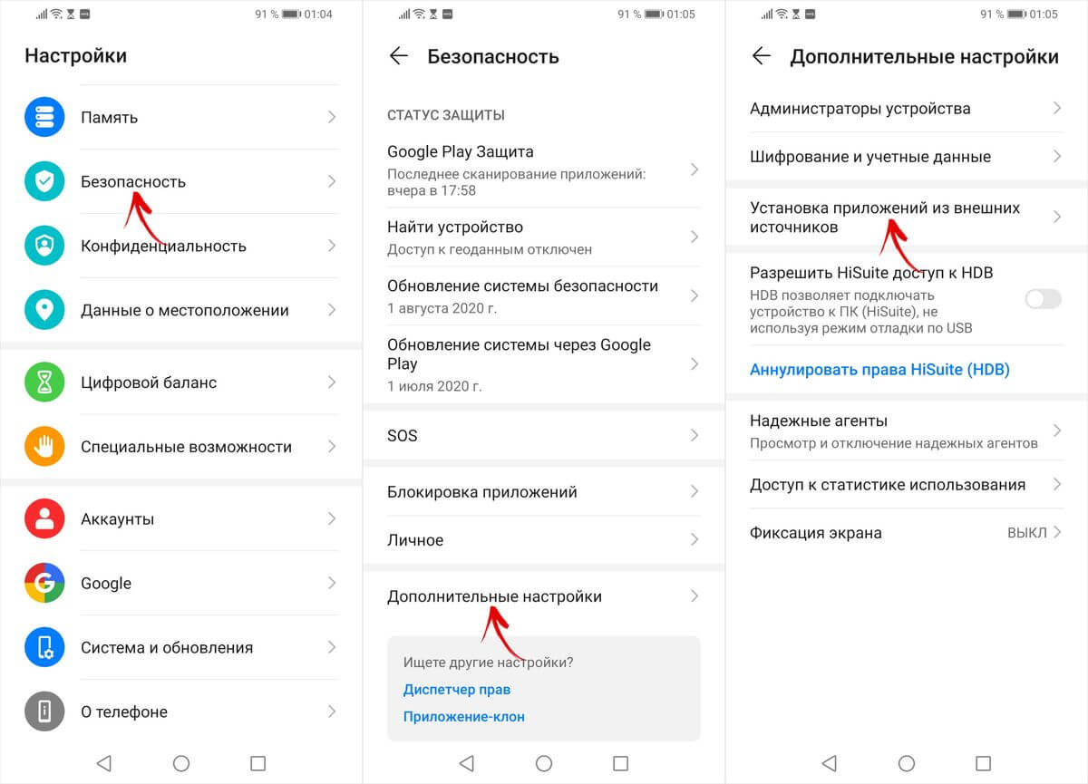 Чтобы разрешить установку неизвестных приложений на смартфонах Huawei и Honor, зайдите в «Настройки» и перейдите в раздел «Безопасность». Откройте подраздел «Дополнительные настройки» и тапните по пункту «Установка приложений из внешних источников».