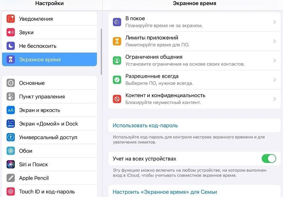Настроить «Экранное время» в рамках «Семейного доступа» можно следующим образом: