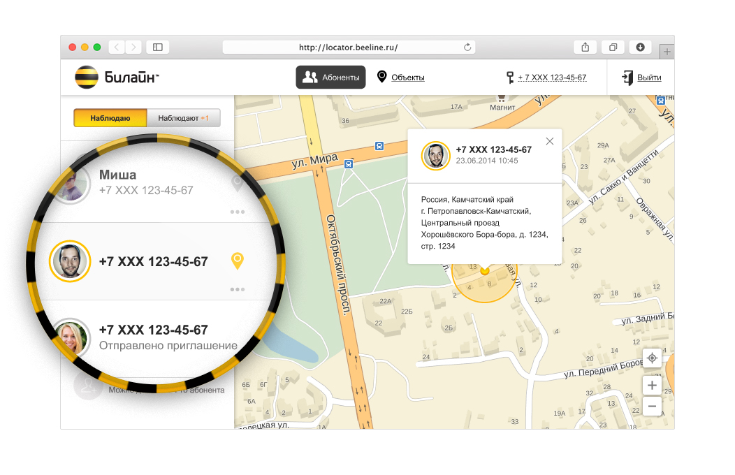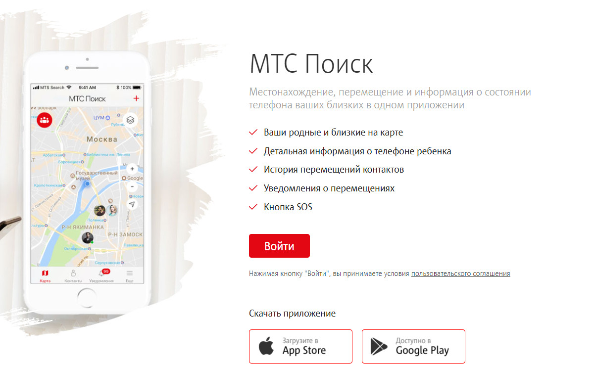 Компания предлагает сервис «Локатор» для быстрого определения местонахождения абонента. Последние места, посещенные человеком, доступны на сайте услуги и в приложении. Бесплатный период – 7 дней, далее со счета абонента списывается 7 рублей в сутки.