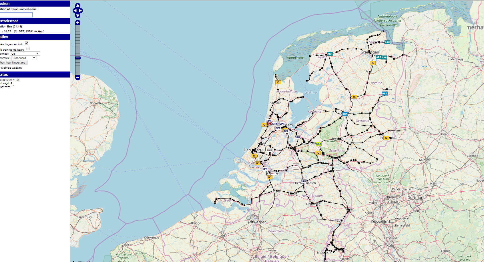 В отличие от сервиса РЖД, Spoorkaart показывает в реальном времени перемещение составов по стране. Все они окрашены в разные цвета. Есть адаптированная под гаджеты версия сайта, функция масштабирования. Информация обновляется каждые 4-5 секунд.