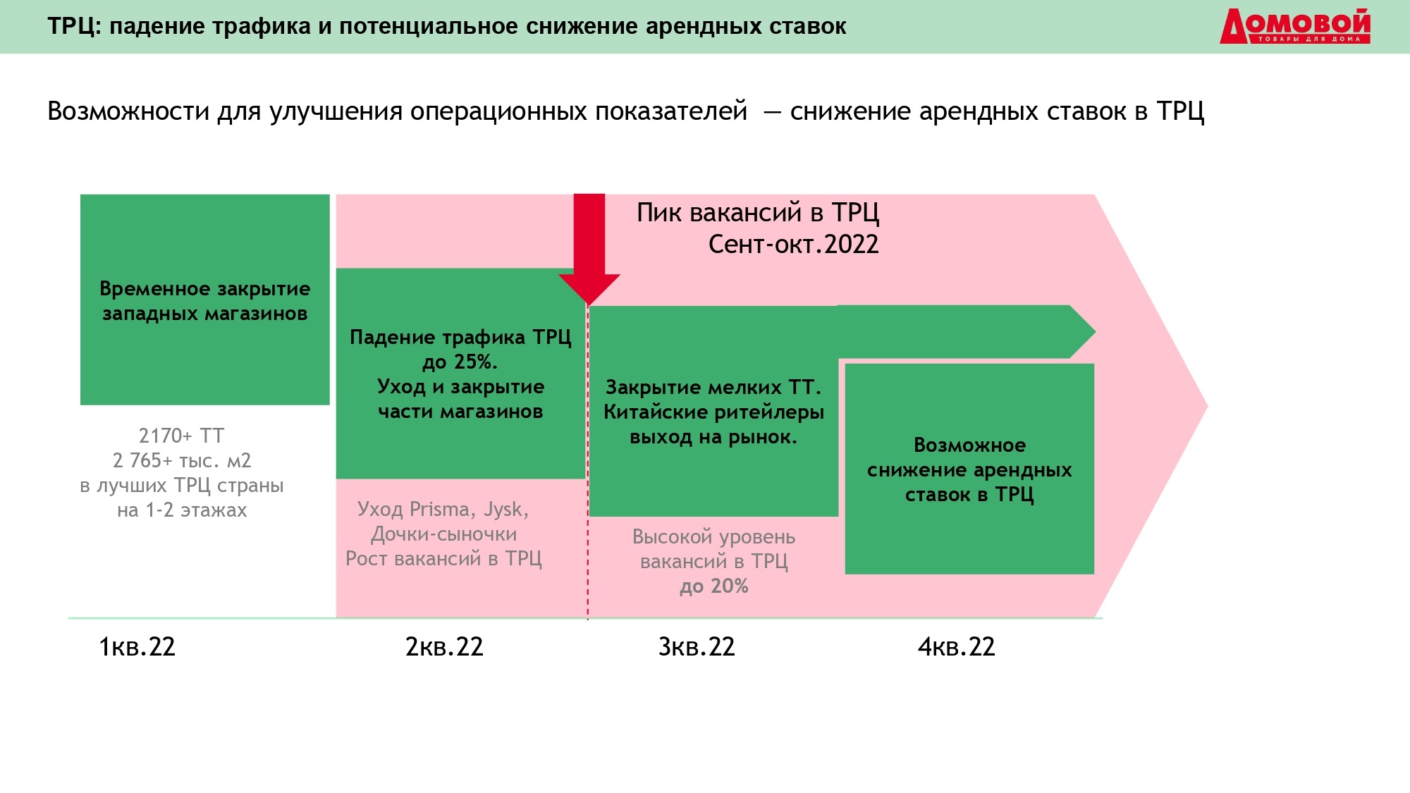 «Домовой» поставляет товары из 25 стран, но в связи с мартовскими событиями мы практически потеряли все маршруты доставки через Европу. Идет глобальная перестройка логистики. Товары пытаются ввести напрямую из Китая и Азии по железной дороге через Казахстан и г. Владивосток. Но пропускная способность ж/д транспорта ограничена. В третьем квартале 2022 года ожидаем выхода китайских и турецких ритейлеров на российский рынок.