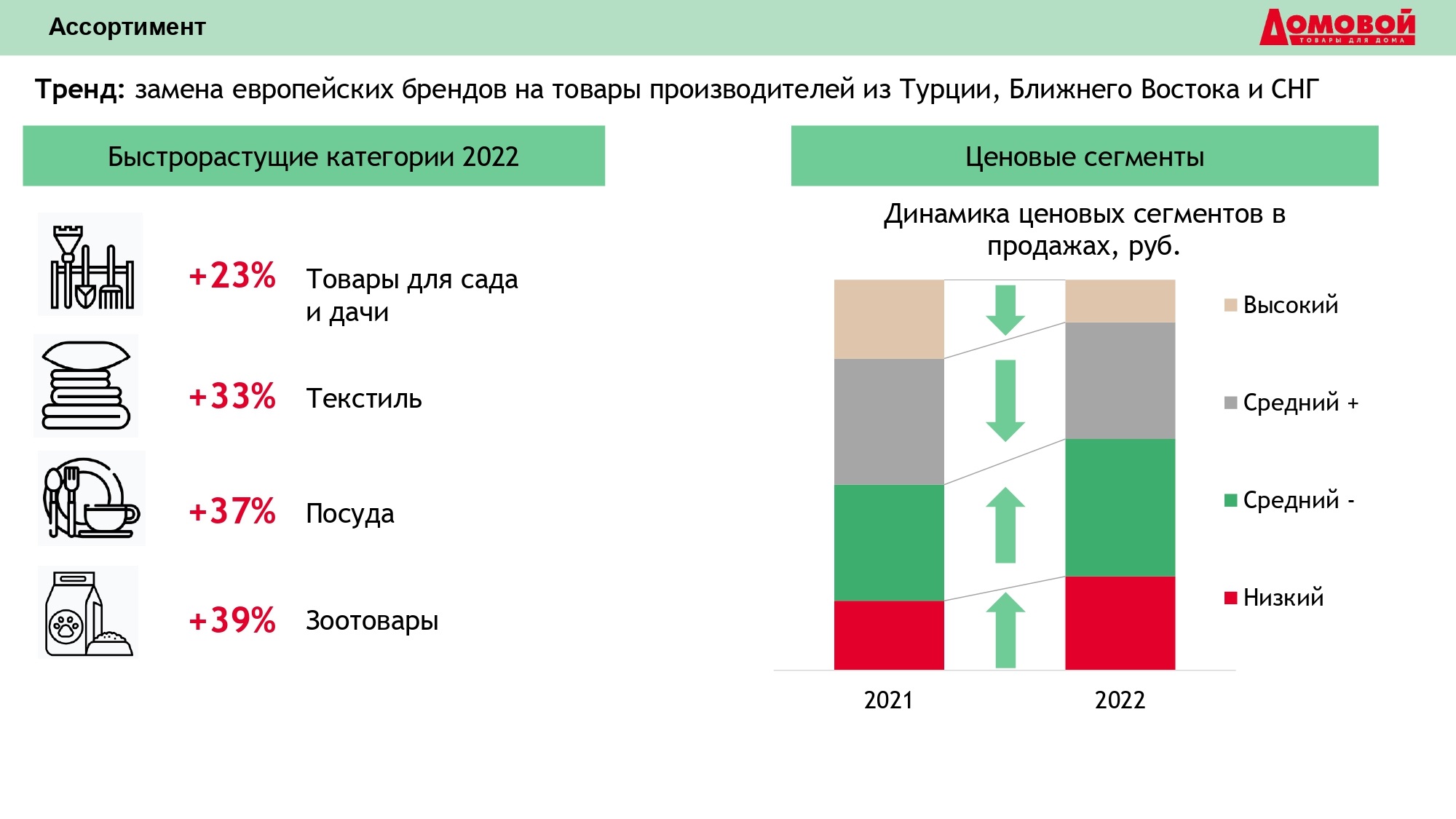 «Первый квартал 2022 года, с одной стороны, стал вызовом, а с другой – дал прирост по четырем основным категориям: зоотовары (+39%), посуда (+37%), текстиль (+33%), товары для сада и дачи (+23%).