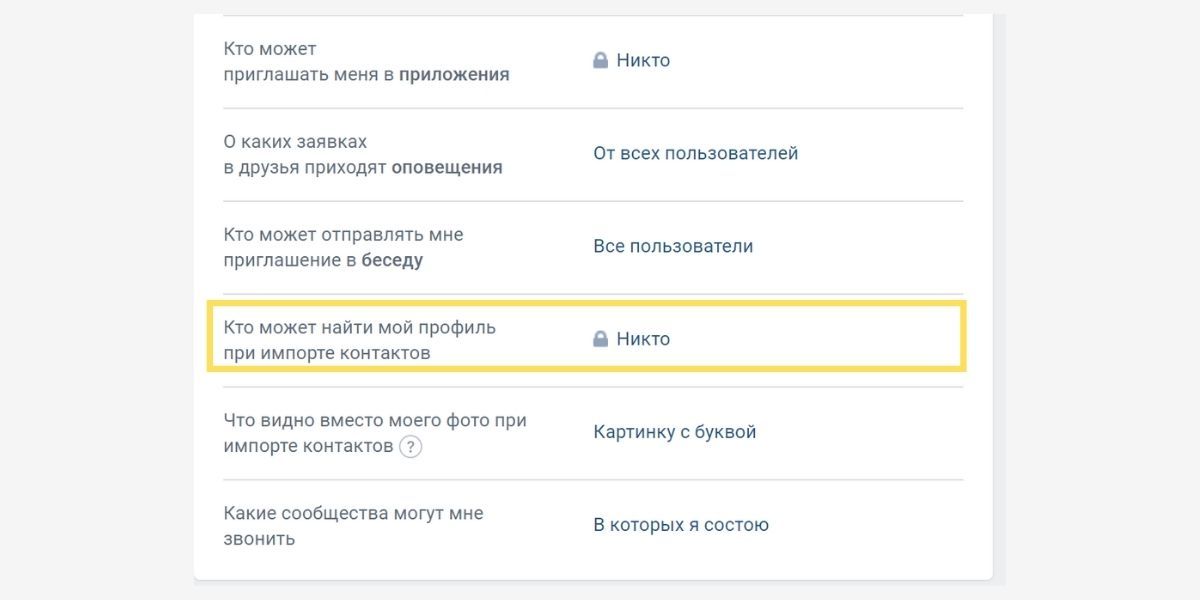 - Выберите настройки в пункте «Кто может найти мой профиль при импорте контактов»: никто, друзья друзей или все, кроме выбранных аккаунтов.