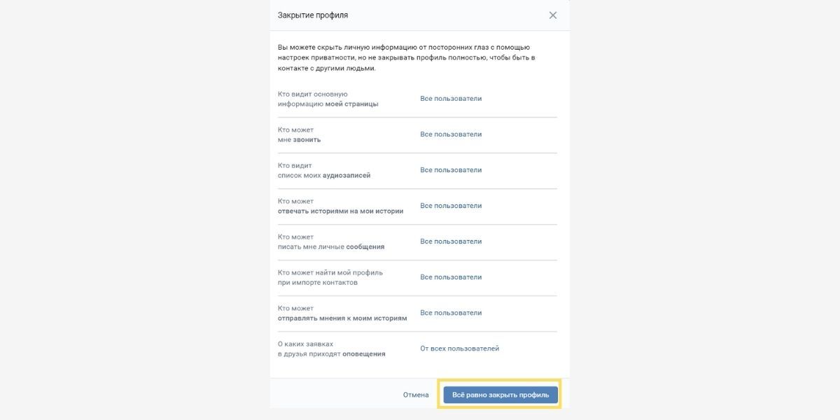 На это действие ВК попросит подтверждение, после чего все данные будут доступны только друзьям.