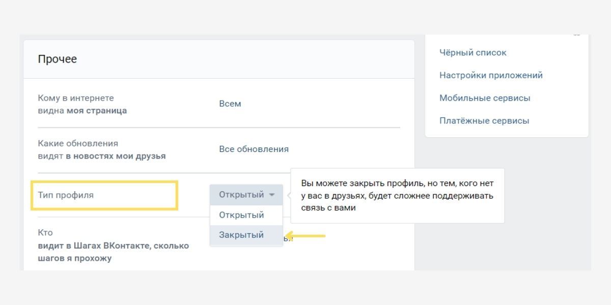 Как только откроется следующая страница, листайте её в самый низ. Там должен находиться раздел «Прочее». Находите там пункт «Тип профиля» и жмете левой кнопкой мышки по строке «Открытый». На скриншоте ниже будет все отмечено.
