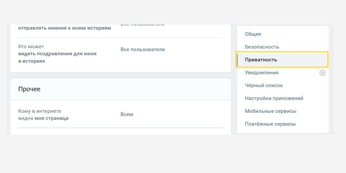 - После выполнения вышеуказанного действия, вас перекинет на новую страницу. Здесь вам необходимо будет отыскать графу «Приватность» и нажать по ней.