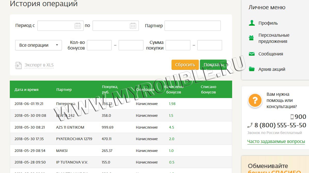 2 В открывшемся окне будут отражены все ваши операции в порядке начисления бонусов. Имейте в виду: у разных продавцов бонусы начисляются в разные сроки, так что хронологического порядка в истории операций может и не быть. Например, по акциям от партнеров Сбера баллы Спасибо часто начисляют сразу, а стандартные 0,5% могут идти до бонусного счета несколько суток. На странице истории можно задать нужный временной период, систематизировать покупки по числу бонусов, а также выгрузить статистику в файл .xls (открывается в Excel и других подобных программах).