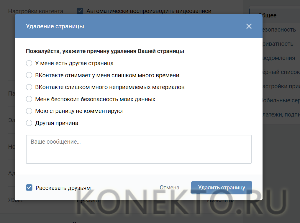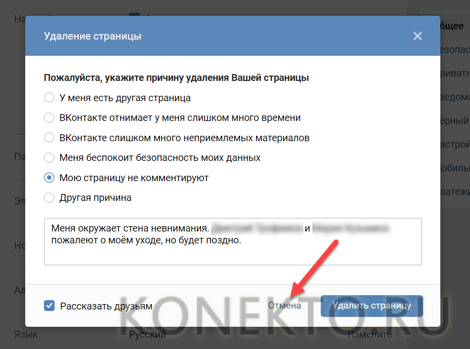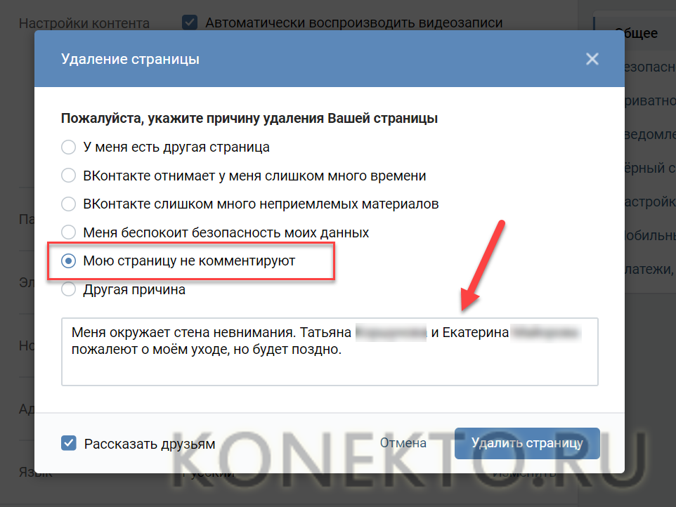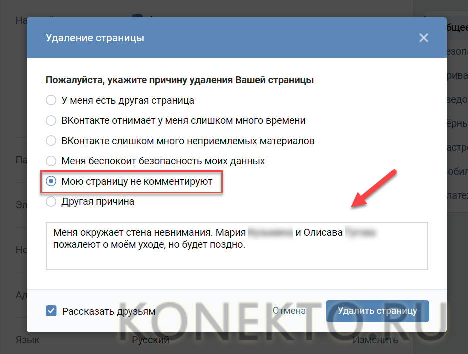 В результате в открывшемся окне необходимо будет указать причину удаления страницы, а именно, «Мою страничку не комментируют». Таким образом, в нижней части окна появится оповещение о том, что следующие пользователи (имена и фамилии будут указаны) пожалеют о вашем уходе.