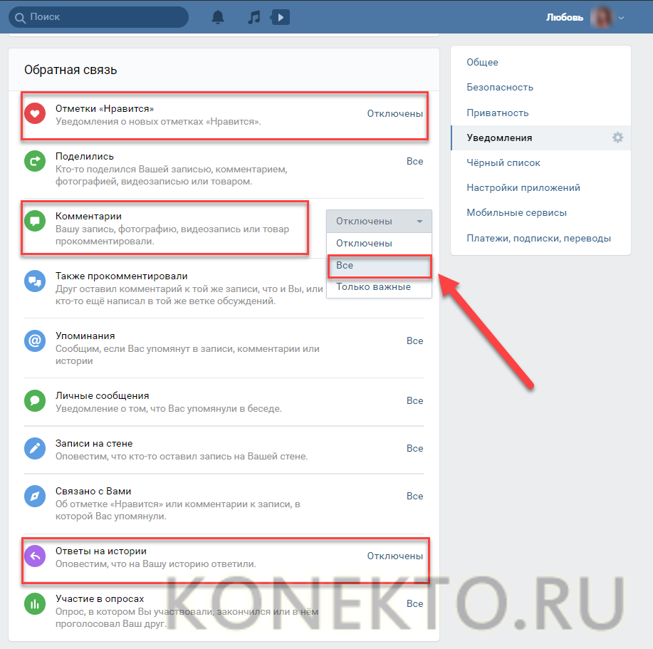 Находим блок «Обратная связь» и смотрим, какие опции выключены. На скрине видно, что сняты уведомления об отметках «Мне нравится», «Комментарии» и «Ответы на истории». Чтобы включить их, необходимо щелкнуть по «Отключены» и выбрать в появившемся списке подходящий вариант.