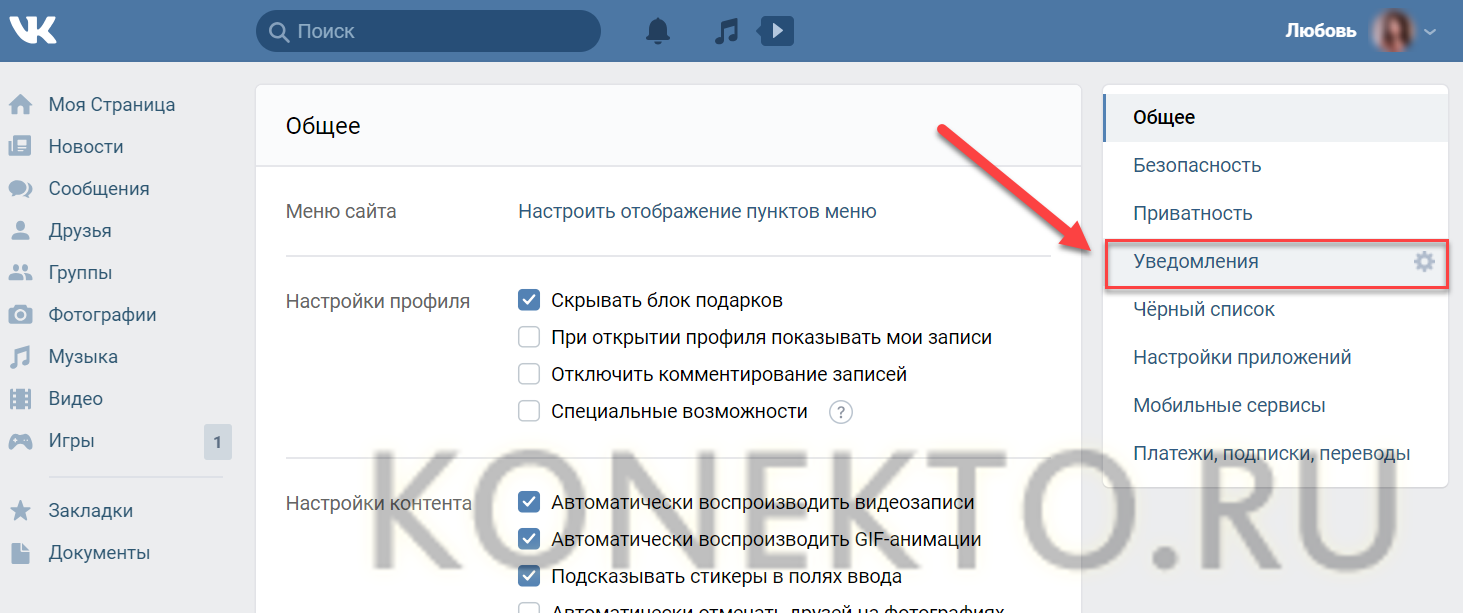 Откроются общие настройки. Следует перейти в «Уведомления», щелкнув по ним в списке, расположенном справа.