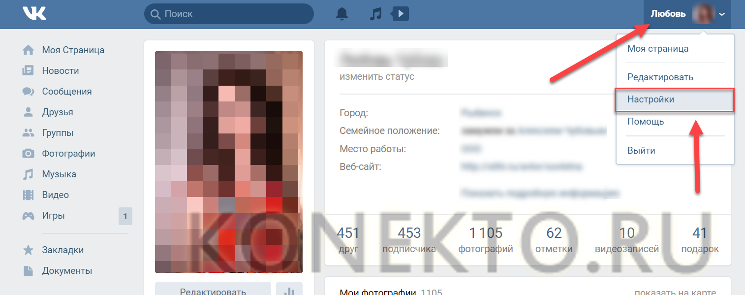 Кликаем по своему имени в правом верхнем углу страницы и выбираем «Настройки».