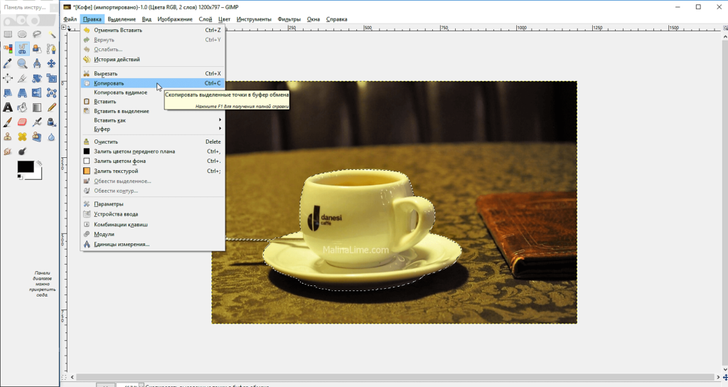 В панели инструментов, слева, кликните на иконку с изображением ножниц, это «Умные ножницы»(!). Теперь левой кнопкой мыши кликните на начало контура, который Вы хотите вырезать. В данном случае, это чашка. Далее, продолжайте ставить точки на контуре, а ножницы будут соединять каждую последующую точку с предыдущей (На рисунке точки 1,2,3,4). Таким образом будет формироваться линия обрезки. Обойдите все изображение по контуру до той точки, откуда начали. Когда весь путь пройден, скопируйте выделенный фрагмент в буфер обмена. Сейчас объясню зачем, но сначала, как. Нажмите «Правка», в раскрывшемся списке команд выберите «Копировать», также можно воспользоваться клавишами CTRL+C.