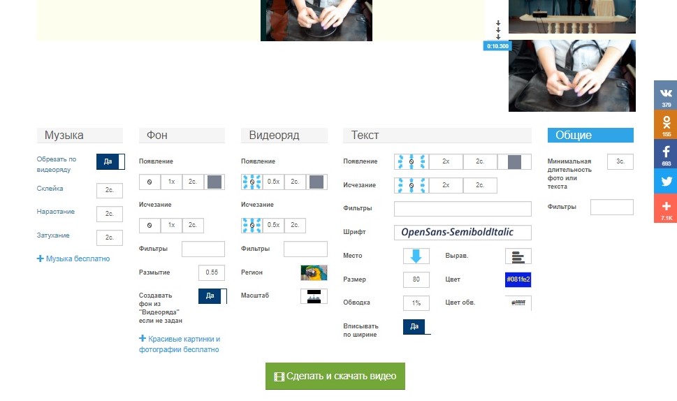 Когда закончите работу над роликом, нажмите «Сделать и скачать видео». Обработка длится недолго, после нее вы сможете предварительно посмотреть свой видеоклип и сохранить его на компьютер или опубликовать в соцсетях.