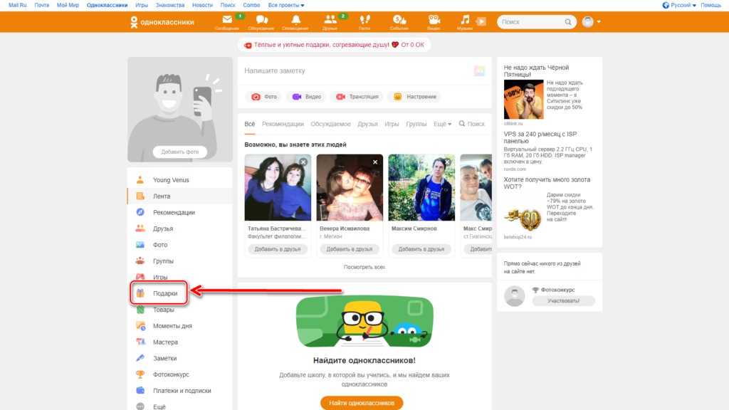 Для улучшенной коммуникации разработчики портала сделали систему подарков. Приобрести их можно за внутреннюю валюту (о ней − позже). Отправить такой подарок можно любому пользователю. Он увидит как саму иконку, так и ваш комментарий. На сегодняшний день все новые пользователи получают 3 бесплатных подарка в качестве бонуса. Рекомендуется воспользоваться ими как можно скорее.