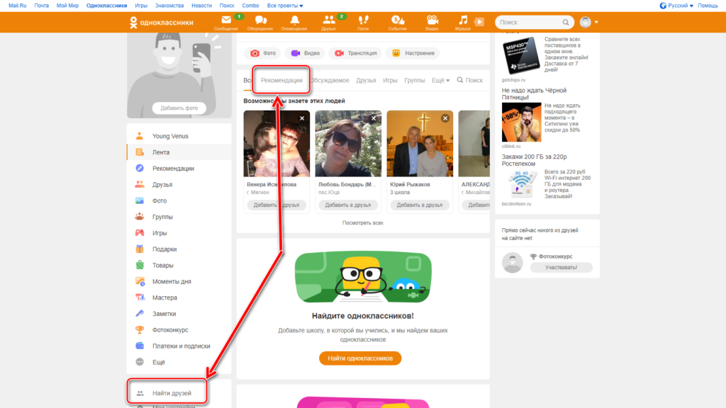 Если же вы еще не знаете, с кем общаться, то воспользуйтесь поиском друзей. Сделать это можно как в рекомендациях над лентой, так и в отдельном разделе «Найти друзей». Нельзя не отметить широкий выбор фильтров для поиска. Они позволят найти наиболее подходящих людей и завязать с ними общение.