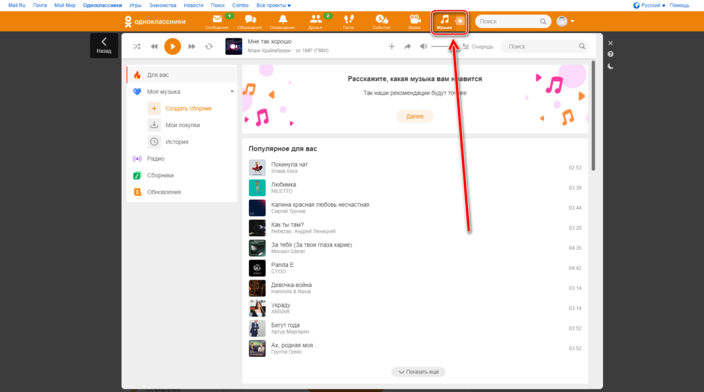 Для музыкальных композиций предусмотрен отдельный раздел. Найти его можно в навигационном меню в верхней части любой страницы сайта. Здесь можно добавлять свои композиции или слушать чужие. А также собирать плейлисты, сборники и делиться ими с друзьями.