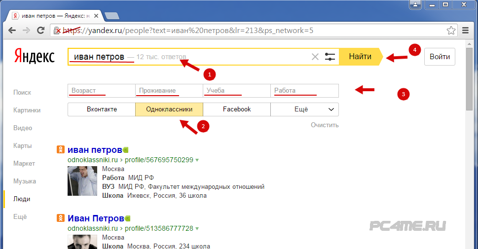 перейти на поиск Яндекса по социальным сетям (откроется в новом окне) и ввести в окно данные человека, выбрать вкладку «Одноклассники», указать дополнительные данные и нажать «Поиск»;