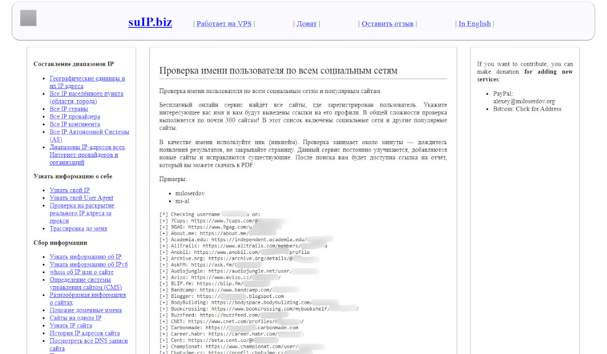 Она позволяет собирать досье на человека по имени пользователя, проверяя наличие учетных записей на огромном количестве сайтов (более 2300) и собирая всю информацию с доступных страниц. Не использует никаких ключей API. Это, кстати, форк другой OSINT-утилиты — Sherlock. Обрати внимание, что по умолчанию поиск запускается не по всем сайтам, а только по 500 самых популярных.