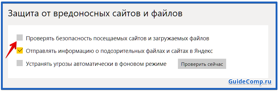 - В подразделе «Защита от угроз» уберите отметку напротив «Проверять безопасность посещаемых сайтов и загружаемых файлов».