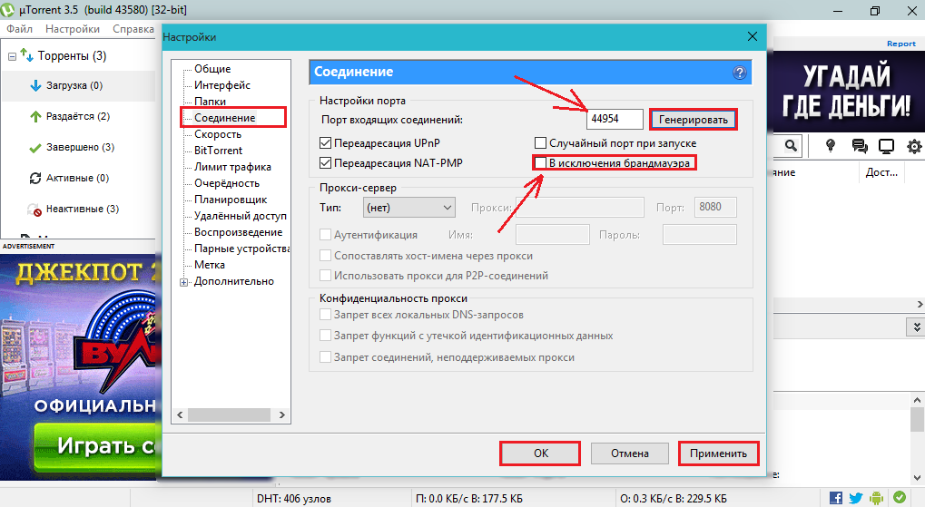 Шаг 2. В открывшемся окне необходимо перейти на вкладку «Соединение» и в верхнем правом углу окна нажать кнопку «Генерировать» и поставьте галочку напротив строки «В исключения брандмауэра». Цифры слева от кнопки изменятся. Они обозначают адрес порта. После генерации нового порта нажмите кнопки «Применить» и «Ок». Если скачивание файла не началось, то повторите данную процедуру два или три раза.