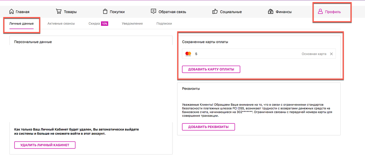 Если вы хотите удалить вашу банковскую карту из аккаунта, во избежание дальнейших списаний, перейдите в Профиль -> Личные данные и в списке «Сохраненные карты оплаты» удалите выбранную карту.