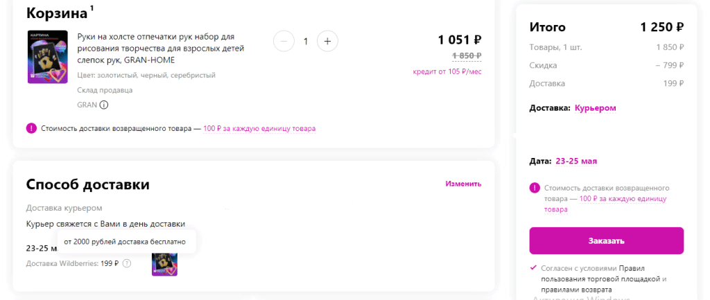 Теперь про условия доставки и ассортимент. Если говорить о Wildberries, то преимуществом является бесплатная доставка. Покупатель может оформить заказ на максимум 50 вещей без предоплаты, спокойно примерить их дома, оценить качество и фасон, а затем оплатить курьеру только те вещи, которые подошли.