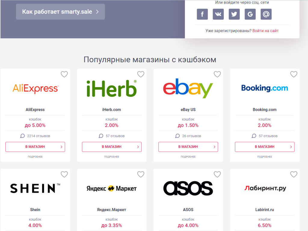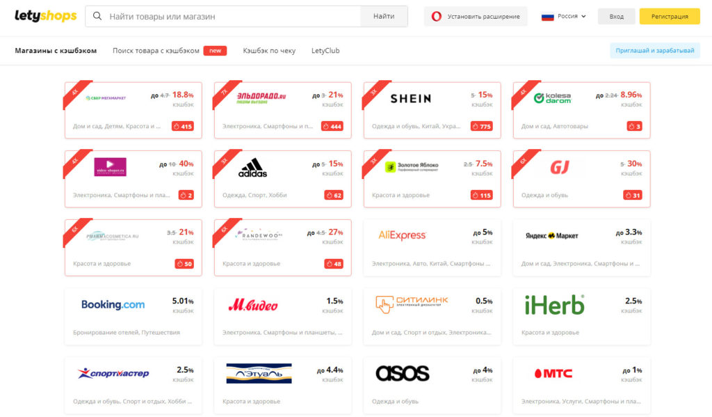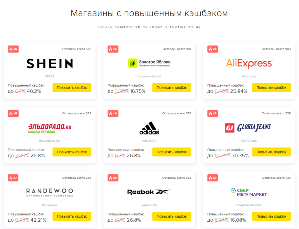 На этой площадке чуть более 800 магазинов, но самые крупные и популярные площадки там присутствуют. Новым пользователям дается повышенный кешбэк, правда, покупку нужно совершить в течение 5 дней после регистрации.