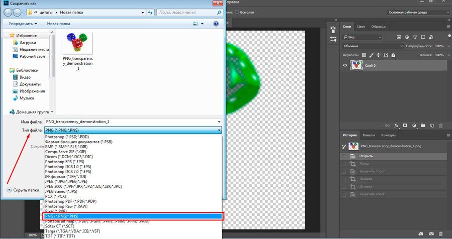 Затем выбираете нужный тип файла, png и готово. Он есть в любой версии. Если не видите – ищите внимательнее. Без него никак. Уверяю вас.