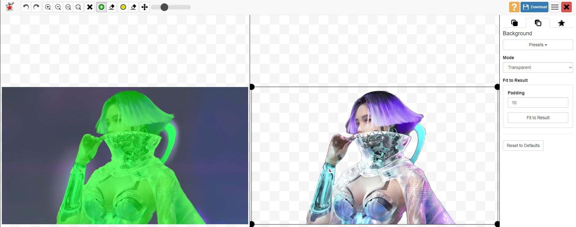 Еще один бесплатный автоматический обработчик фотографий, который неплохо справляется с удалением различных фонов с изображений. Достаточно загрузить картинку и сервис сразу отобразит результат. Изначально контуры могут быть слишком оборванными или сервис захватит не весь объект (зацепит другие), но это легко поправить. В левой области отображается редактор, на котором зеленым цветом подсвечивается вырезанная область (она показывается справа уже в готовом виде). Довольно просто вручную подрезать или добавить нужную часть изображения. В плане гибкости и простоы использования это один из лучших сервисов по удалению фона онлайн.