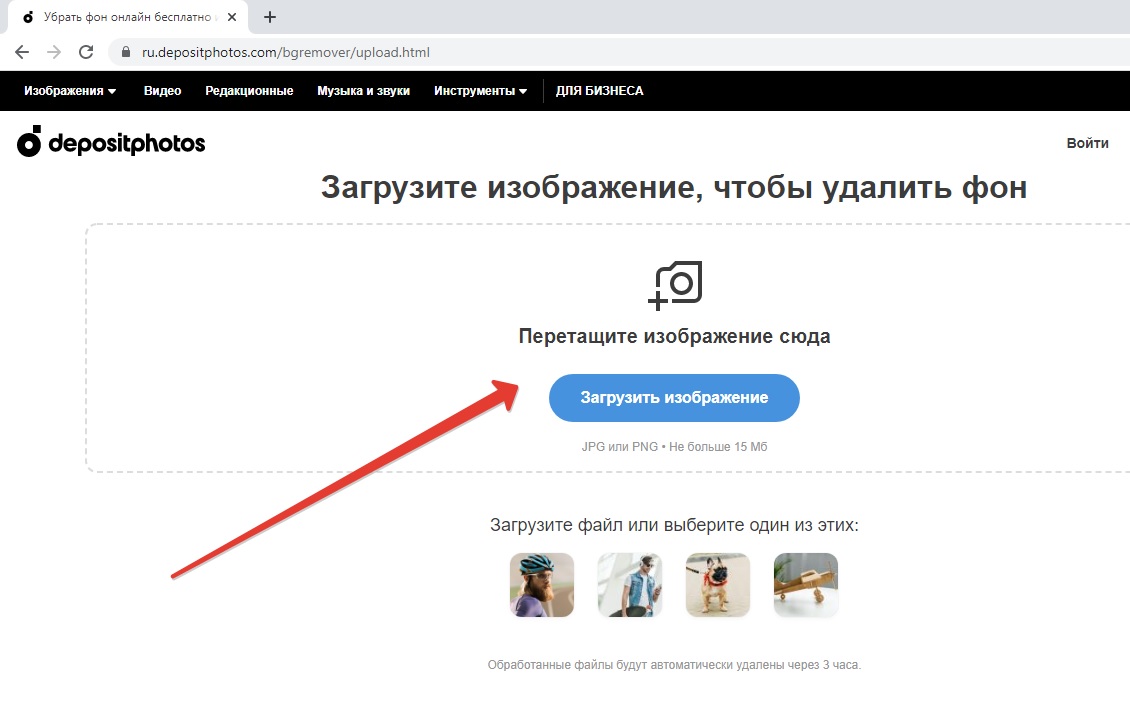 Шаг 1. Перейти по адресу https://ru.depositphotos.com/bgremover/upload.html или в разделе «Инструменты» на сайте https://ru.depositphotos.com/ выбрать «Бесплатное удаление фона».