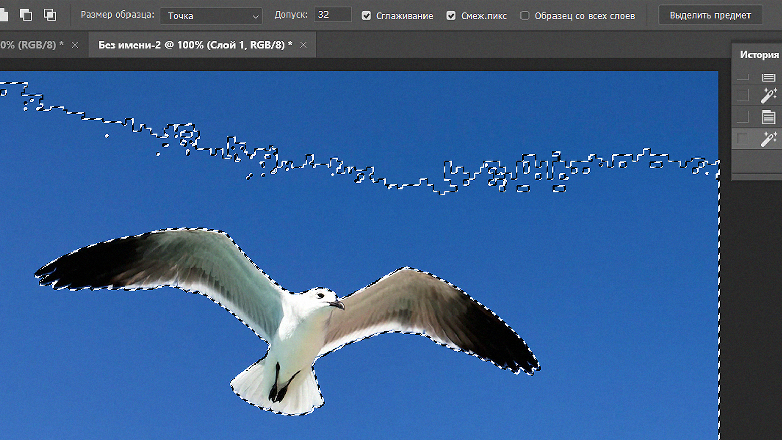 «Допуск» (Tolerance) ― параметр, отвечающий за точность выделения у границ объекта. Хотя на краю объекта пиксели выглядят как фоновые, на самом деле они незначительно отличаются. Слишком маленький допуск оставит ореол вокруг объекта, а слишком большой может выделить лишние участки на границах объекта внутри. По умолчанию в настройках установлено значение 32 ― его можно назвать оптимальным.