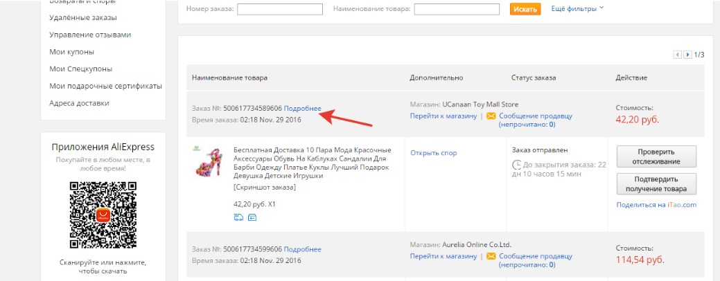 - Если же ждать вы не желаете, тогда рекомендуем связаться с продавцом через сайт Алиэкспресс. Перейдите на страницу заказа, нажмите на «Подробнее». Учтите, что письмо продавцу необходимо будет писать на английском языке (при необходимости воспользуйтесь услугами онлайн-переводчика). Ответ обычно приходит в течение недели. Если же срок защиты заканчивается, лучше сразу открыть спор.
