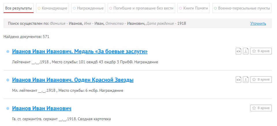 Результаты поиска базы сайта будут представлены списком из однофамильцев, среди которых может быть ваш герой. Рассмотрим пример, введем данные бойца Иванов Иван Иванович, 1918 г.р.: