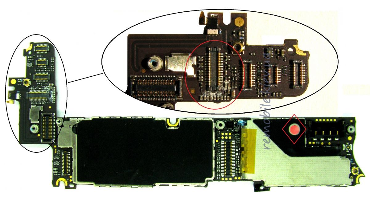 Но не всегда всё так легко. Допустим, уронили в воду iPhone, а в нем батарейку так просто не достать, не разбирая устройство. В таком случае, если Вы не можете в самое ближайшее время обратиться в сервисный центр, советую положить iPhone в рис (только не смейтесь, но это действительно помогает! самый обычный пищевой рис, по началу сам не верил, но после того как люди приносли утопленные iPhone, высушенные в рисе, при ремонте действительно было видно, что воздействия влаги минимальны). На фотографии показана плата утопленного iPhone 4, который положили в рис, а потом привезли в сервис. Плата была идеально чистая, единственное что окислилось, это разъем сенсорного экрана (отмечено красным кружочком). Красным ромбиком показан индикатор попадания жидкости в iPhone.