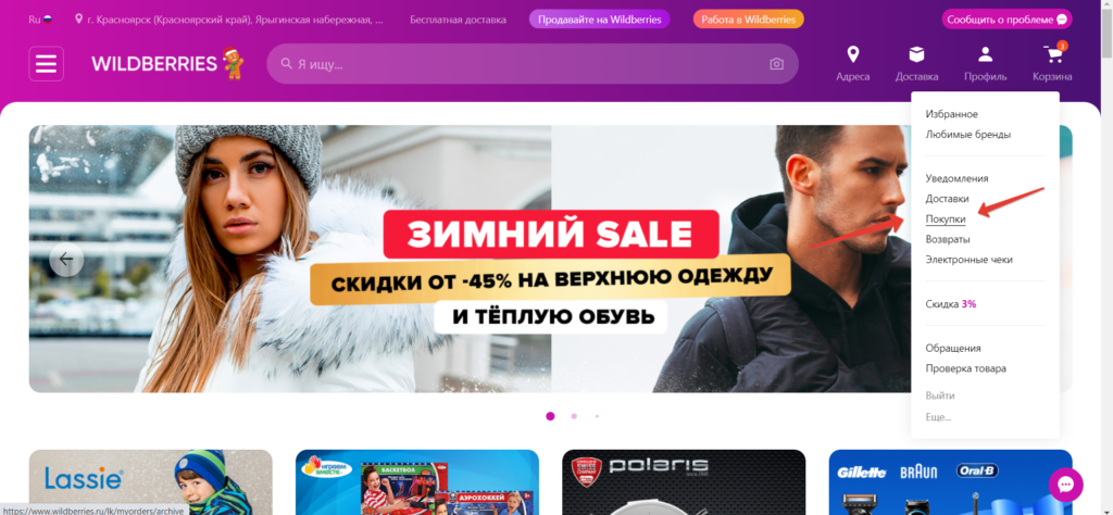 - Войдите на сайт Вайлдберриз в ту учетную запись, с которой совершалась покупка, перейти в раздел «Покупки» и выбрать «История покупок».