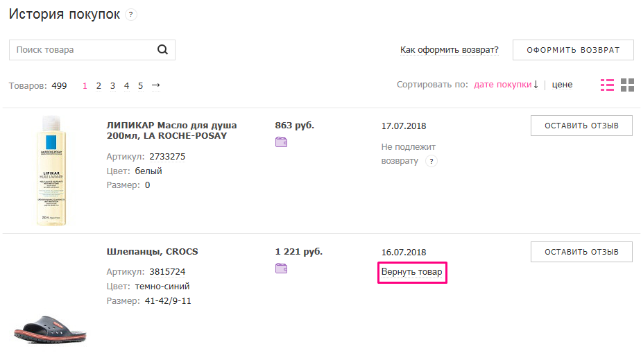 - Откроется перечень купленных товаров. Вам нужно выбрать тот, который хотите вернуть и нажать «Вернуть товар».